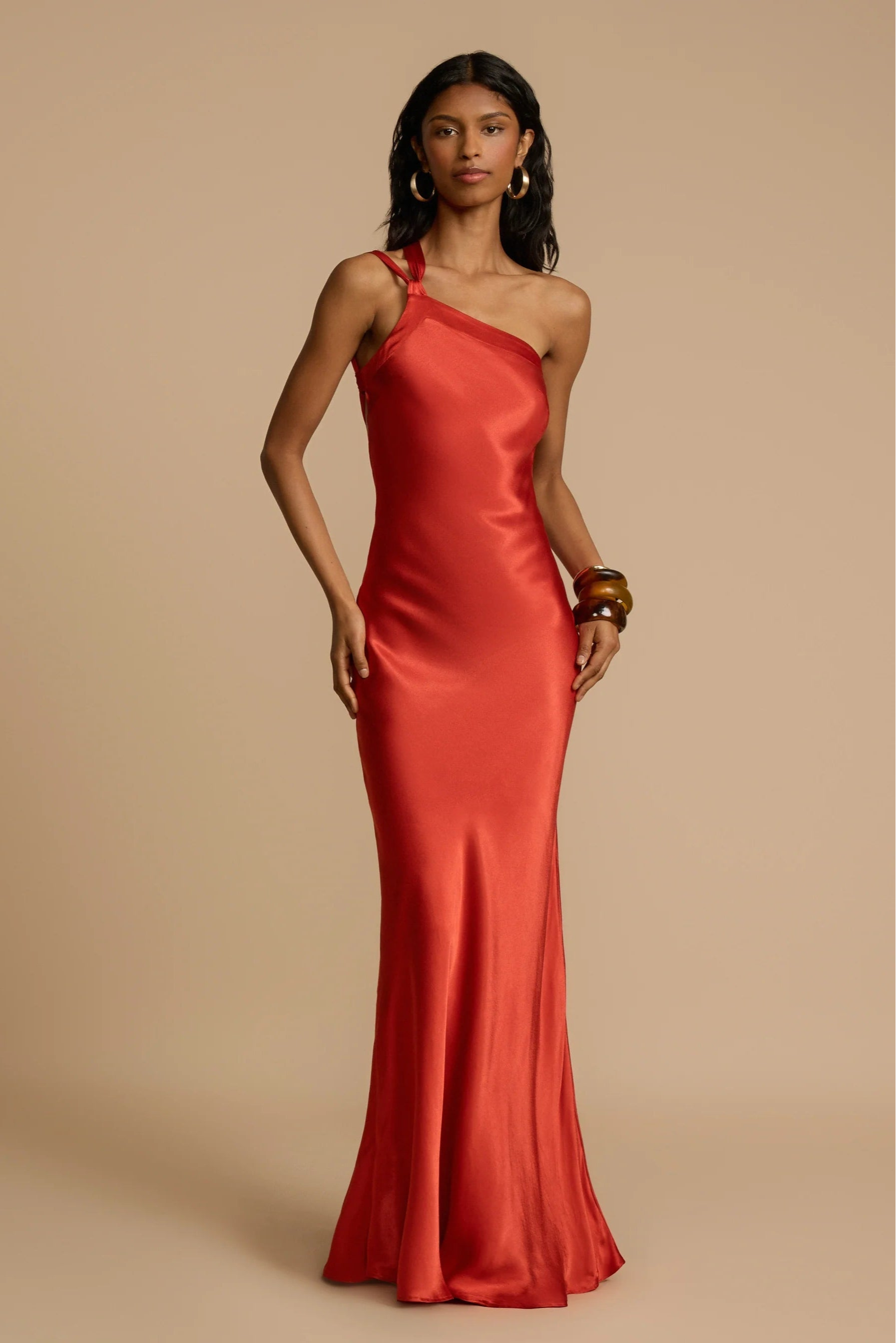 Poliéster acetinado com excelente caimento em comprimentos longos — não fica "pesado" em baixo nem cria volume indesejado. O corte valoriza a cintura e deixa o quadril livre. Para mulheres acima de 1,68m, o comprimento de 149–153cm vai ficar no tornozelo; em alturas menores, pode tocar o chão com salto baixo.